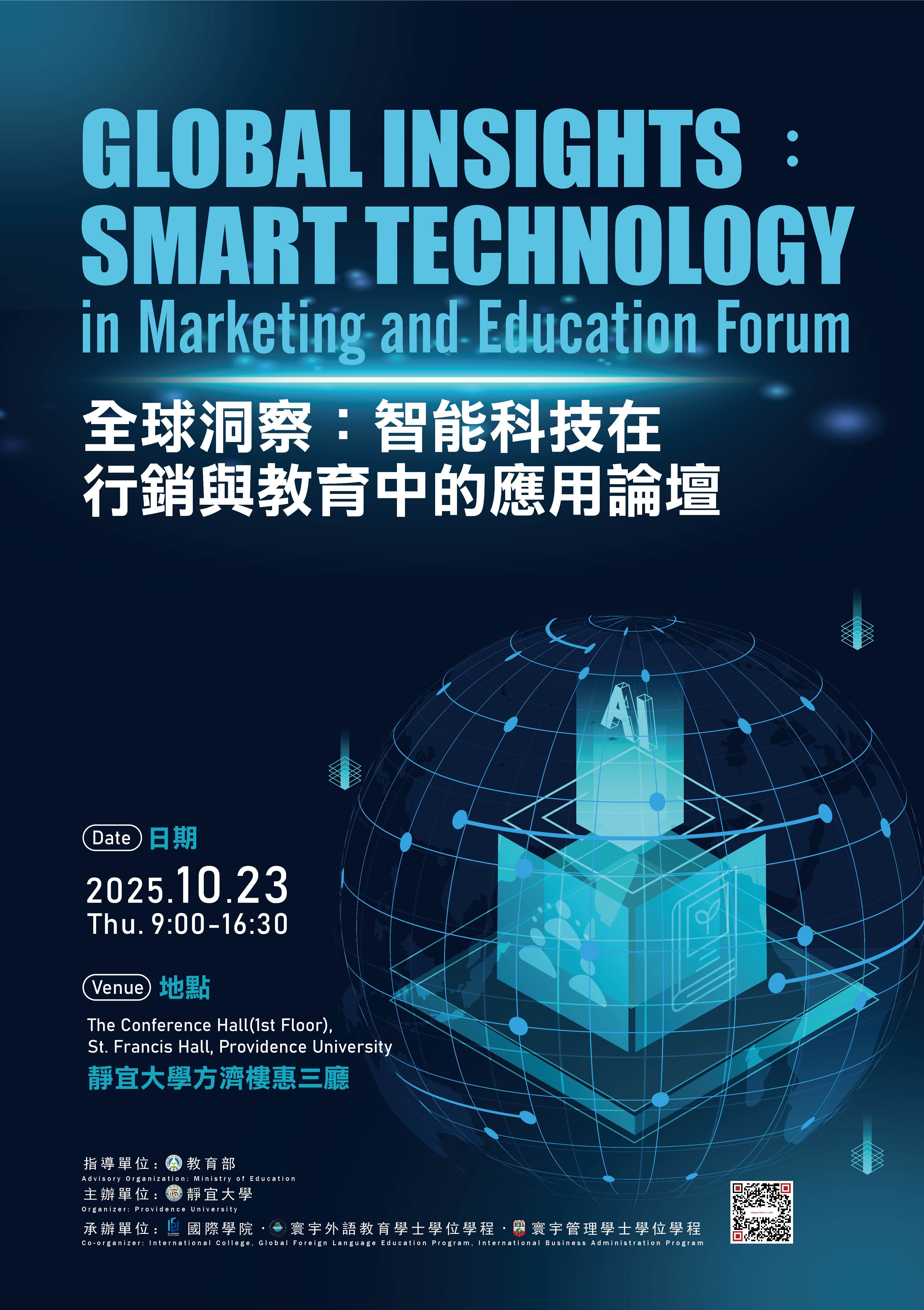 主 旨: 檢送本校國際學院辦理「全球洞察:智能科技在行銷與教育中的應用論壇」,敬請惠予轉知並鼓勵貴校師生踴躍報名參加,請查照。