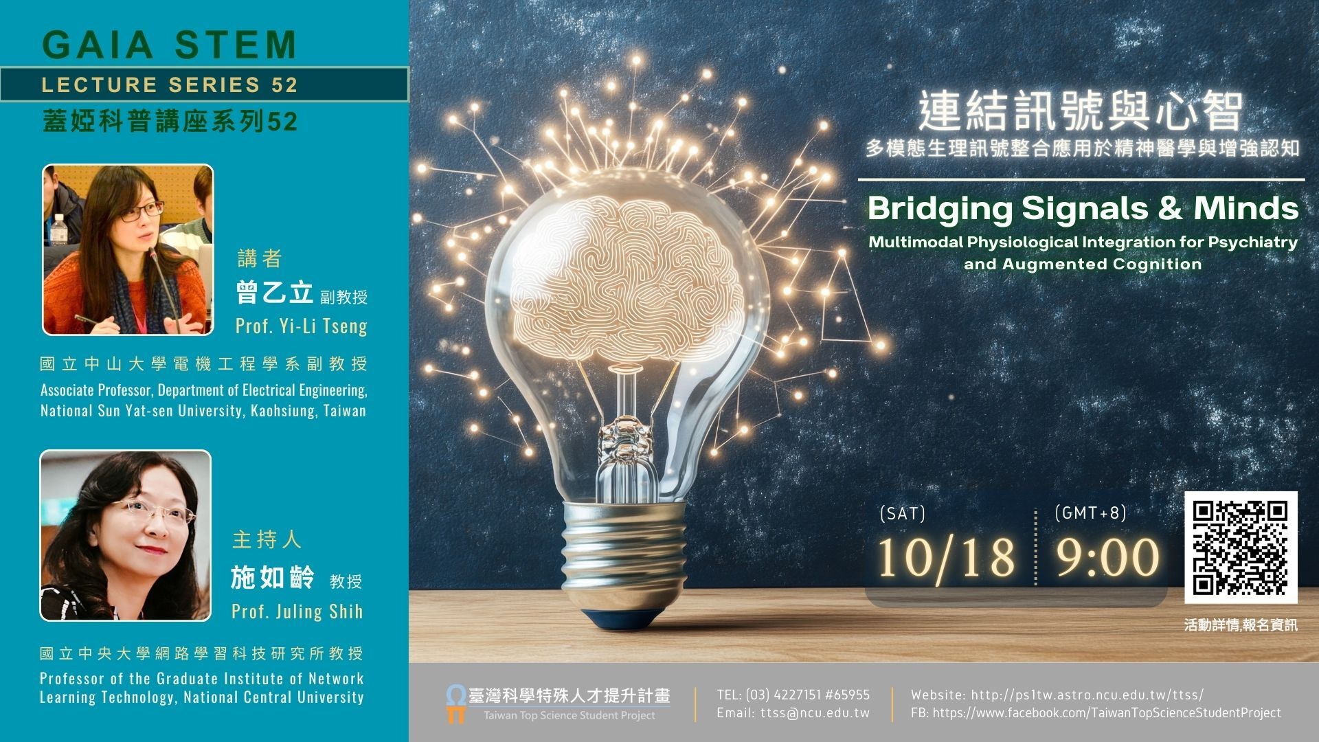 主 旨: 本校訂於114年10月18日辦理線上講座:《蓋婭科普講座系列 52》—— 「連結訊號與心智:多模態生理訊號整合應用於精神醫學與增強認知」,請惠予公告,並轉知貴校所屬師生踴躍報名參加,請查照。