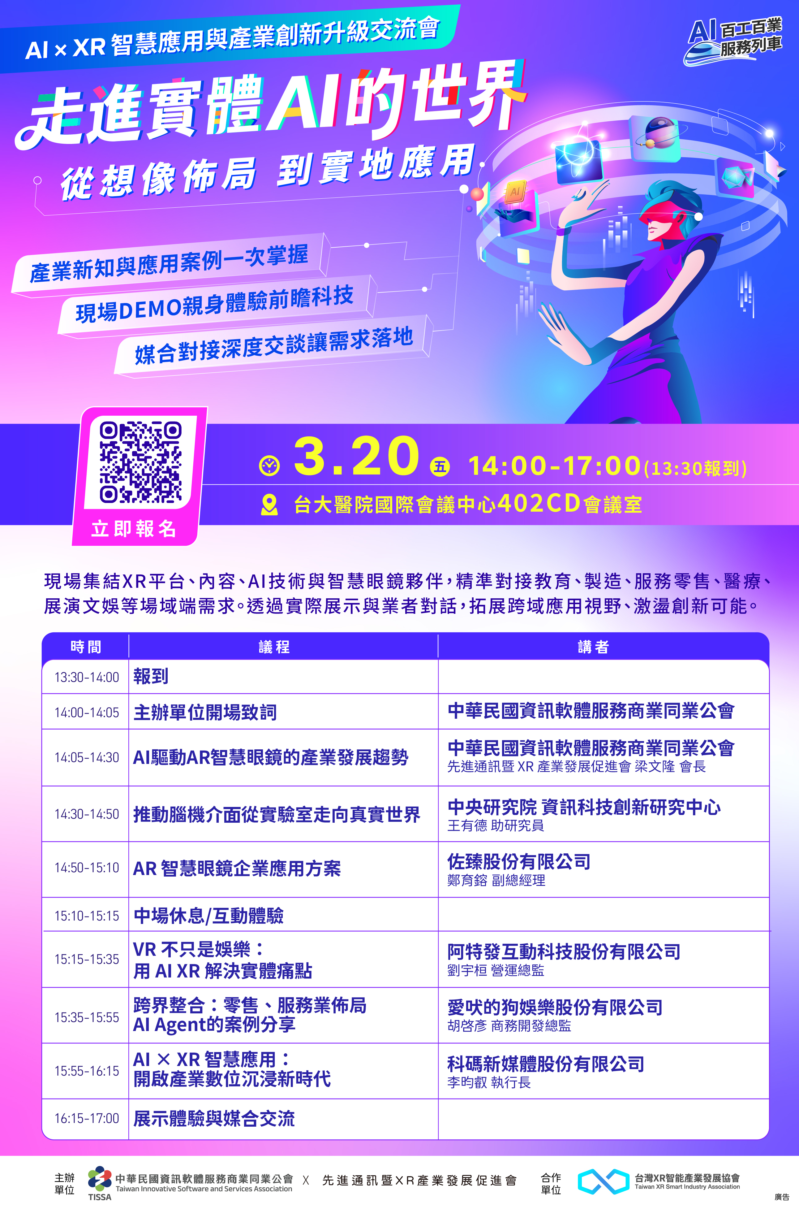一、 為推廣 AI 與 XR 技術之落地應用,協助各產業推動數位轉型,本會先進通訊暨 XR 產業發展促進會辦理旨揭活動。活動將聚焦 AI 驅動 XR 領域之產業發展趨勢,並分享智慧教育與企業實務應用案例;現場亦邀集 AI 與 XR 技術夥伴進行實體展示體驗及交流媒合,期促進跨域合作與應用發展。
